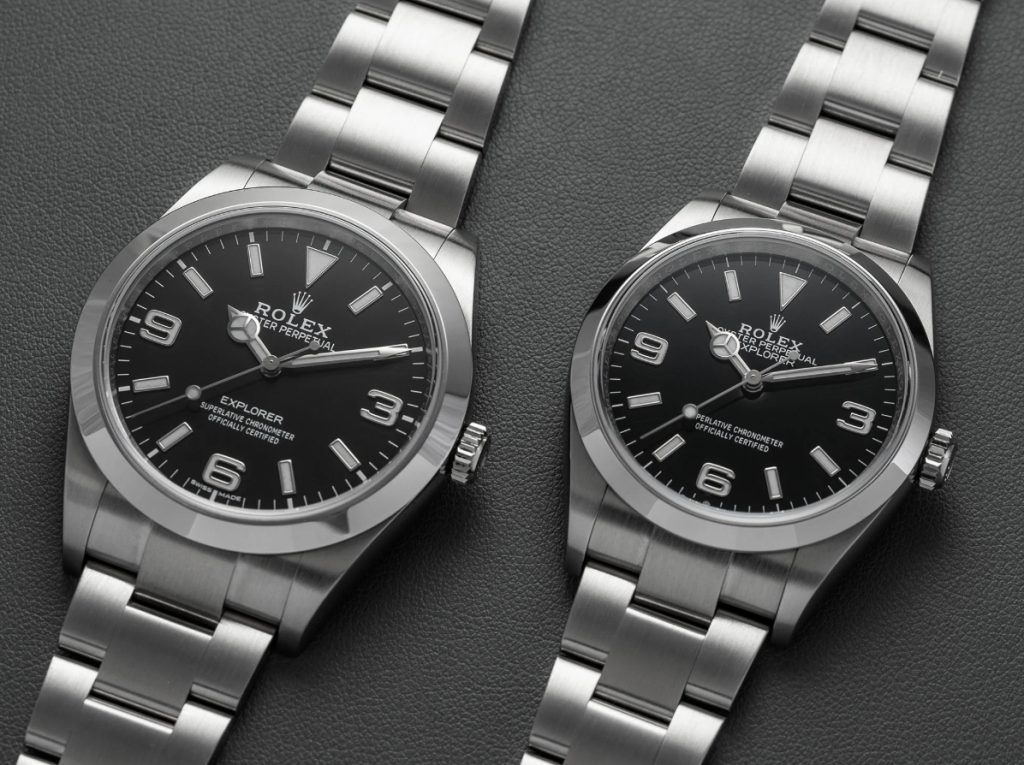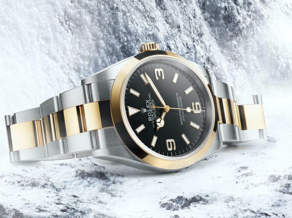 Rolex Explorer I in RolesorBy 2021, watch-world trends had shifted again, back toward more modest dimensions and a return to vintage looks overall. Rolex didn’t have to look very far to find Swiss clone Rolex watches in its lineup that would fit the bill, and one that wouldn’t even require any major overhauls design-wise. The Explorer I Ref. 124270, released during that year’s virtual Watches & Wonders exhibition, not only returned the Explorer I to its classic 1953 proportions (at the same time upgrading the movement inside yet again, to automatic Caliber 3230, Rolex’s most optimized movement to date in terms of precision, magnetic resistance and power reserve); it also was the first Explorer model to be offered not only in the standard 316L “Oystersteel” but also in a bicolor, steel-and-gold version (above) that Rolex calls “Rolesor.” The 36mm, 100-meter water resistant case is paired with an 18k yellow gold bezel and crown; yellow gold is also used for the center links of the Oyster bracelet, whose outer links are made of steel. The gold numerals and markers are filled with Chromalight and the black dial is now lacquered. The dial’s now-familiar “Superlative Chronometer” claim is backed up by the movement, which has been tested to an industry-leading rate tolerance of +2/-2 seconds per day. (For a comparison of the 36mm and 39mm versions of the Explorer, pictured side by side below, click here.)