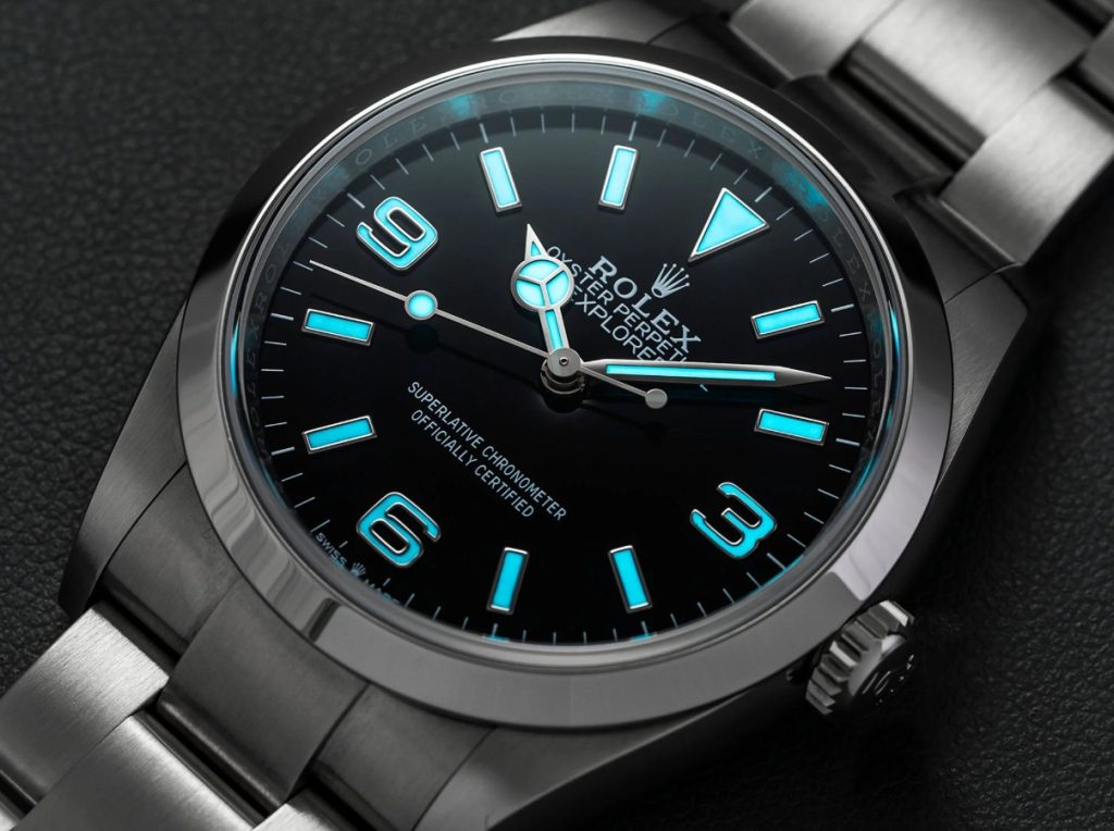Rolex Explorer dial ChromalightRolex is legendary not only for its longstanding capacity to set perfect copy Rolex watches industry trends but also, perhaps even moreso, for its steadfast refusal to follow them. Its watches — the Explorer being a prime example — still look essentially the same in the second decade of the 21st Century as they did in the middle of the 20th. But the industry-wide movement toward “bigger is better” proved to be too widespread for even mighty Rolex to ignore. In 2010, the Explorer, considered a large watch when it debuted at 36mm in 1953, was the dwarf of Rolex’s men’s lineup in 2010. Hence the launch of the Explorer Ref. 214270 at that year’s Baselworld watch fair, which featured an expended 39mm case, a new movement (automatic Caliber 3132, which added a new shock-absorbing system and Rolex’s blue Parachrom hairspring), and initially, no lume on the applied numerals; the latter was rectified in the “Mark 2” models rolled out in 2016, which also had lengthened hands to better fit the wider dial dimensions. This generation of the Explorer I was also the first to incorporate Rolex’s proprietary, blue-glowing Chromalight luminous material on the dial’s hands and markers in place of standard Super-LumiNova.